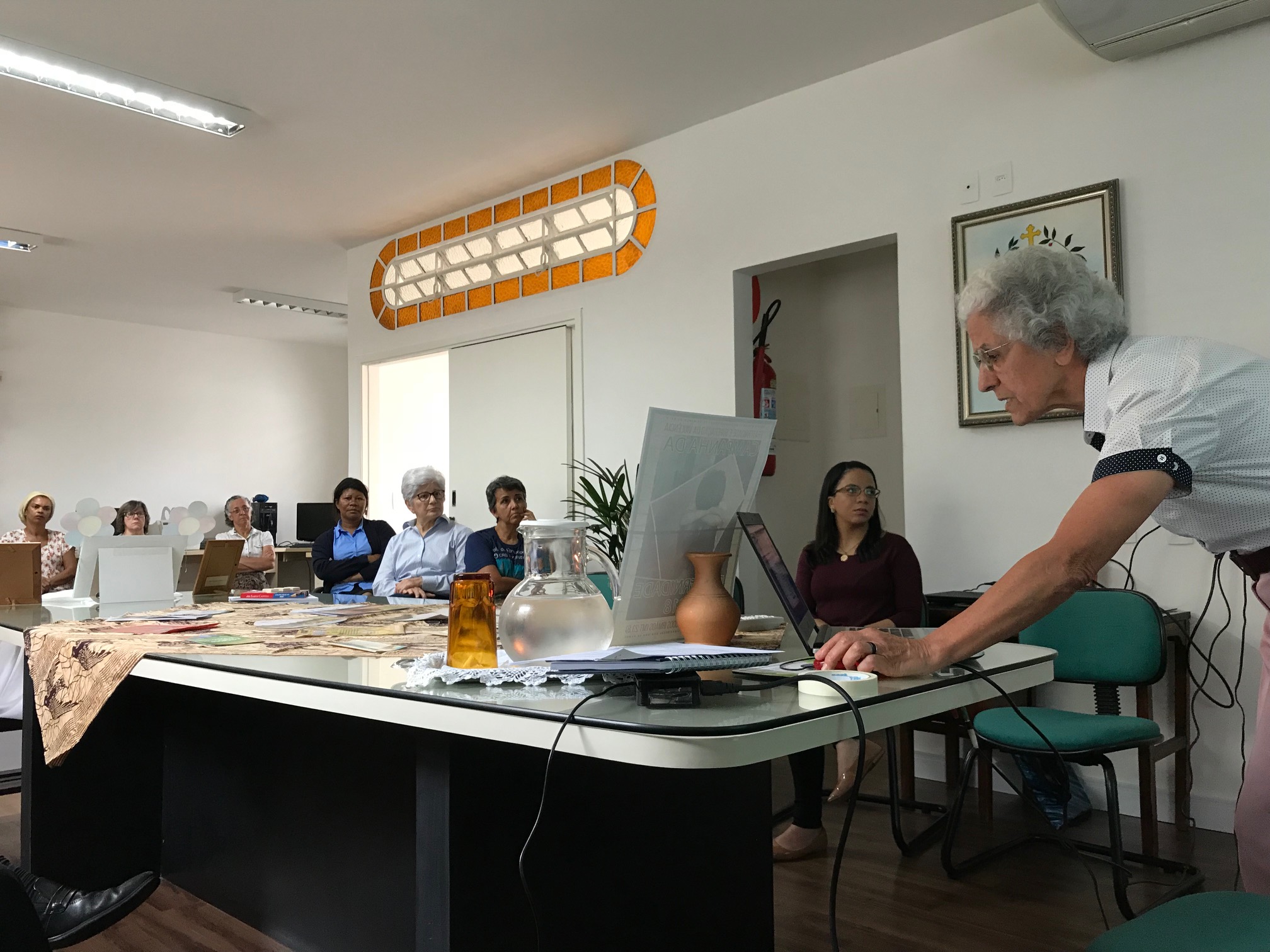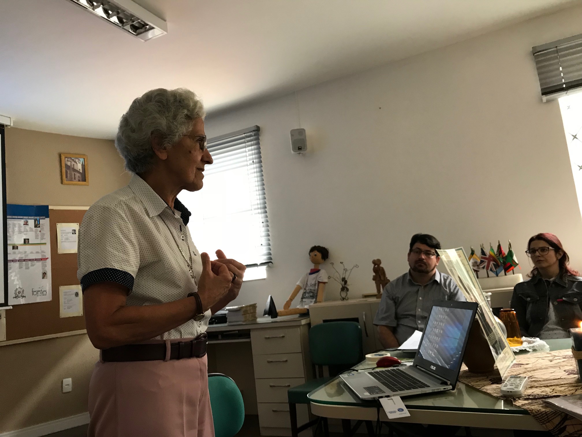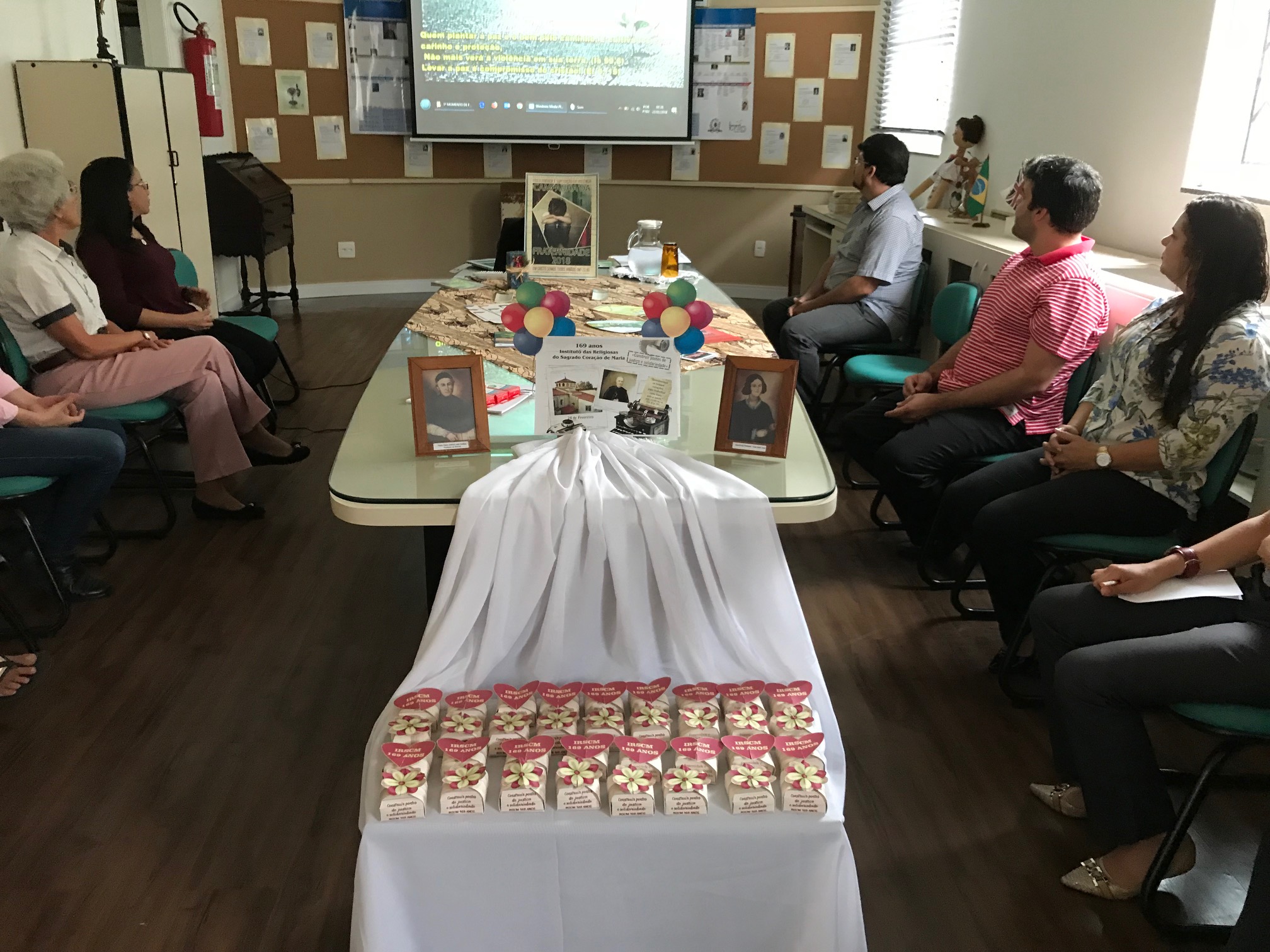 Para o primeiro momento de formação do ano, o grupo convidou a Ir. Rosa de Lima Pereira, Articuladora da Área da Missão e representante do JPIC da Província Brasileira, para tratar a temática. Ir. Rosinha, como é carinhosamente chamada, apresentou a todos como as ‘marcas‘ da Espiritualidade do Instituto (Conhecer Deus e torná-lo conhecido, amar a Deus e fazê-lo amado), o tema da CF 2018: Fraternidade e superação da violência e a frase iluminadora escolhida pelo Conselho Provincial para o triênio 2018-2020: “Construir pontes de justiça e solidariedade” se complementam, e convidou a todos a refletir: como está a minha espiritualidade? Neste momento, aproveitando a comemoração dos 169 anos de fundação do Instituto Sagrado Coração de Maria, Ir. Rosinha também apresentou um pequeno vídeo construído pelos alunos do Colégio Sagrado Coração de Maria, da Província Portuguesa, sobre a vida e trajetória do Padre Gailhac, fundador do Instituto, suas atitudes em benefícios dos mais pobres e sua vontade de ajudar os mais necessitados. Estimulados pelo vídeo exibido, Ir. Rosinha buscou motivar os presentes a pensarem, em silêncio, no seu íntimo, a própria história. Como se construiu essa história de vida, desde a escolha do nome pelos pais ao despertar para a profissão que seguiria? Quais foram as referências para Jean Gailhac? O que, até então, parecia ser “despercebido” na história de vida, mas, neste momento, percebe-se que foi de grande importância e significado para impactar a própria vida? Uma palavra, um olhar dos pais ou dos irmãos, ou alguém de fora da família, mas que motivou a algo bom a ser feito, a ser ‘construído’ ou que valesse à pena fazer parte da ‘caminhada’.
