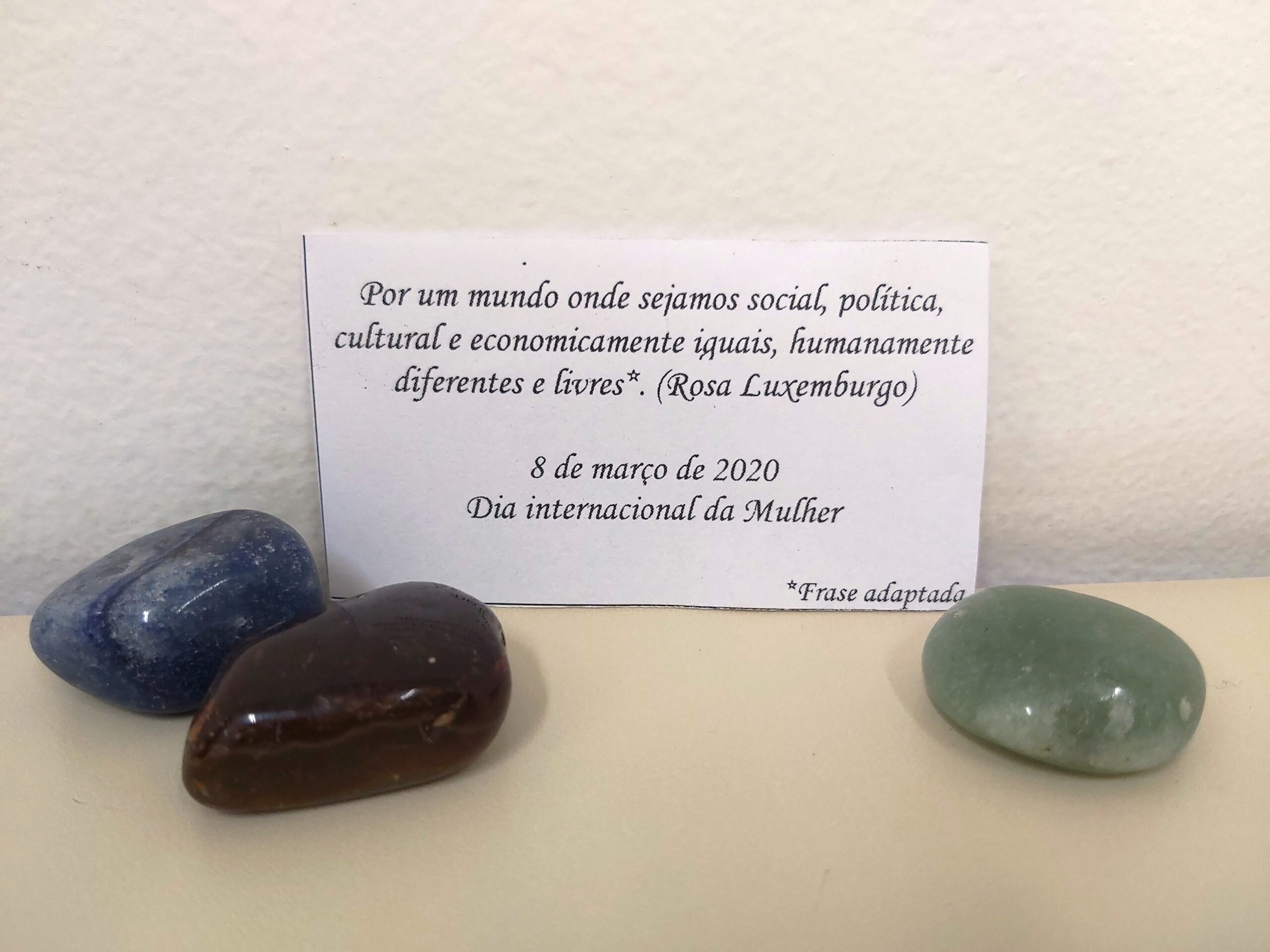 Estamos na luta pela concretização do reino de Deus aqui na terra, que nada mais é que um mundo de justiça, de solidariedade e de equidade. “Jesus foi o profeta itinerante do Reino de Deus. O Reino de Deus foi o sentido da vida Dele, o fio condutor, o eixo de tudo”. Lc. 8,1-2. Mulheres e homens são convidados para fazer acontecer esse reino de Deus. Com este pensamento, cada participante recebeu uma pedra e uma mensagem com os seguintes dizeres: Por um mundo onde sejamos social, política, cultural e economicamente iguais, humanamente diferentes e livres**. (Rosa Luxemburgo). 8 de março de 2020 – Dia Internacional da Mulher”. A pedra representa a essência boa, a virtude, que cada pessoa possui – de forte e bom – que possa contribuir para a concretização do Reino aqui na terra.