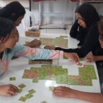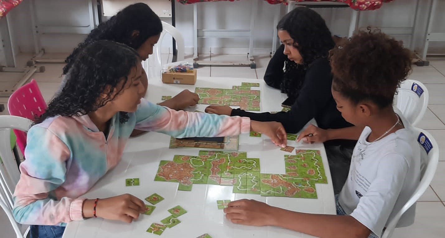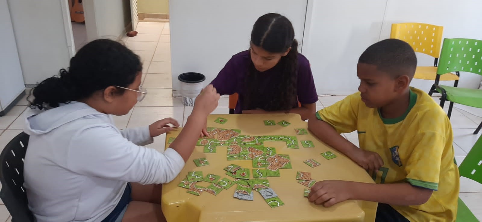 O jogo utilizado para interação é o Carcassonne, um jogo de estratégias, que desafia os participantes a usar o raciocínio lógico e estimula a interação entre eles. A atividade oferece uma alternativa enriquecedora, em substituição às telas, promovendo um aprendizado prazeroso e diversificado.