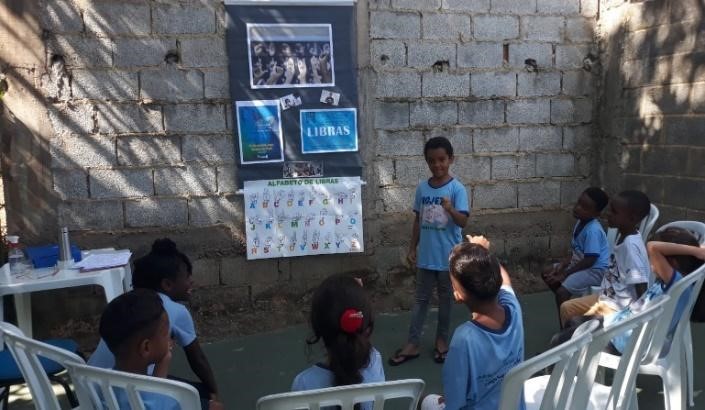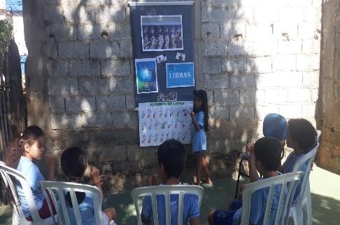 Os beneficiados tiveram muito interesse na atividade, uma vez que, no âmbito social, lidam com diferentes pessoas. Para os grupos de crianças foi utilizado ainda o recurso do vídeo “Aprendendo a falar com as mãos (turma da Mônica)”. Humberto é uma criança surdo/muda, que se comunica pela linguagem de sinais; e a turma, por não conseguir entendê-lo, começa a estudar, para incluí-lo nas atividades coletivas.