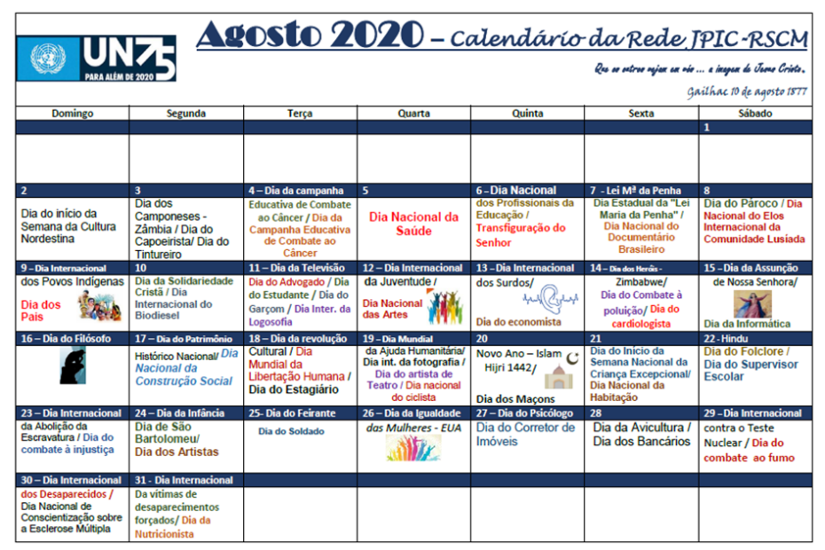 Calendário da Rede JPIC-RSCM – Agosto/2020