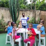 A educadora realizou com as crianças e os adolescentes a dinâmica “Vestindo a Camisa”, que teve por objetivo mostrar, de forma prática, o sentido da Páscoa, utilizando a técnica de dobradura de papel.