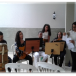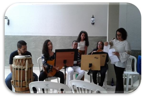 Os colaboradores Leonardo, Samuel, Andreza, Gabriela (Adolescente Projeto Vida), Iracema (Centro Provincial) e Sônia (Família Ampliada do Sagrado Coração de Maria) animaram o momento formando a equipe responsável pelas músicas.