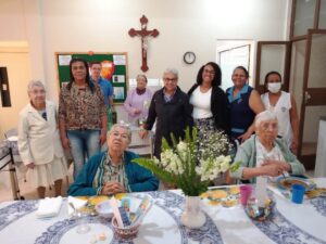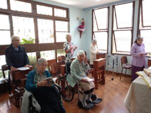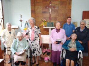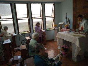 O nosso capelão, Pe. Betto, que há tempos não celebrava conosco por causa do isolamento social, veio dando-nos o melhor presente: a Santa Missa, celebrada na nossa capelinha. E ele, nas intenções, evocou a lembrança dos nossos queridos Pe. Gailhac, Ir. St. Jean, irmãs falecidas, aquelas em plena atividade e as doentes; nossos familiares, a querida Família Ampliada, as pessoas colaboradoras, nas diferentes expressões da Missão, as lideranças no nosso Instituto e as vocações. Rezamos também pela nossa Diocese de Leopoldina que tem como patrona o Sagrado Coração de Maria!