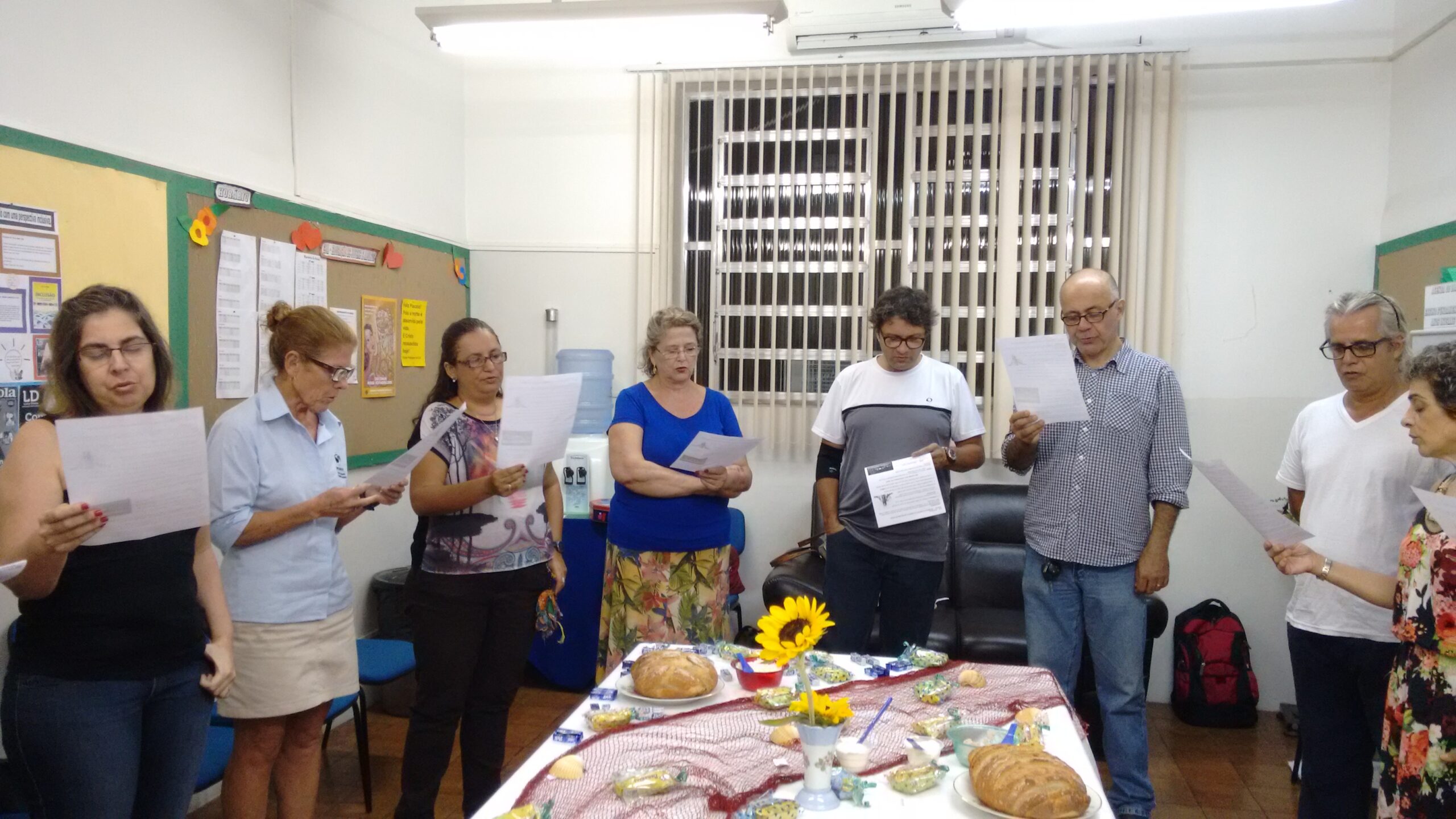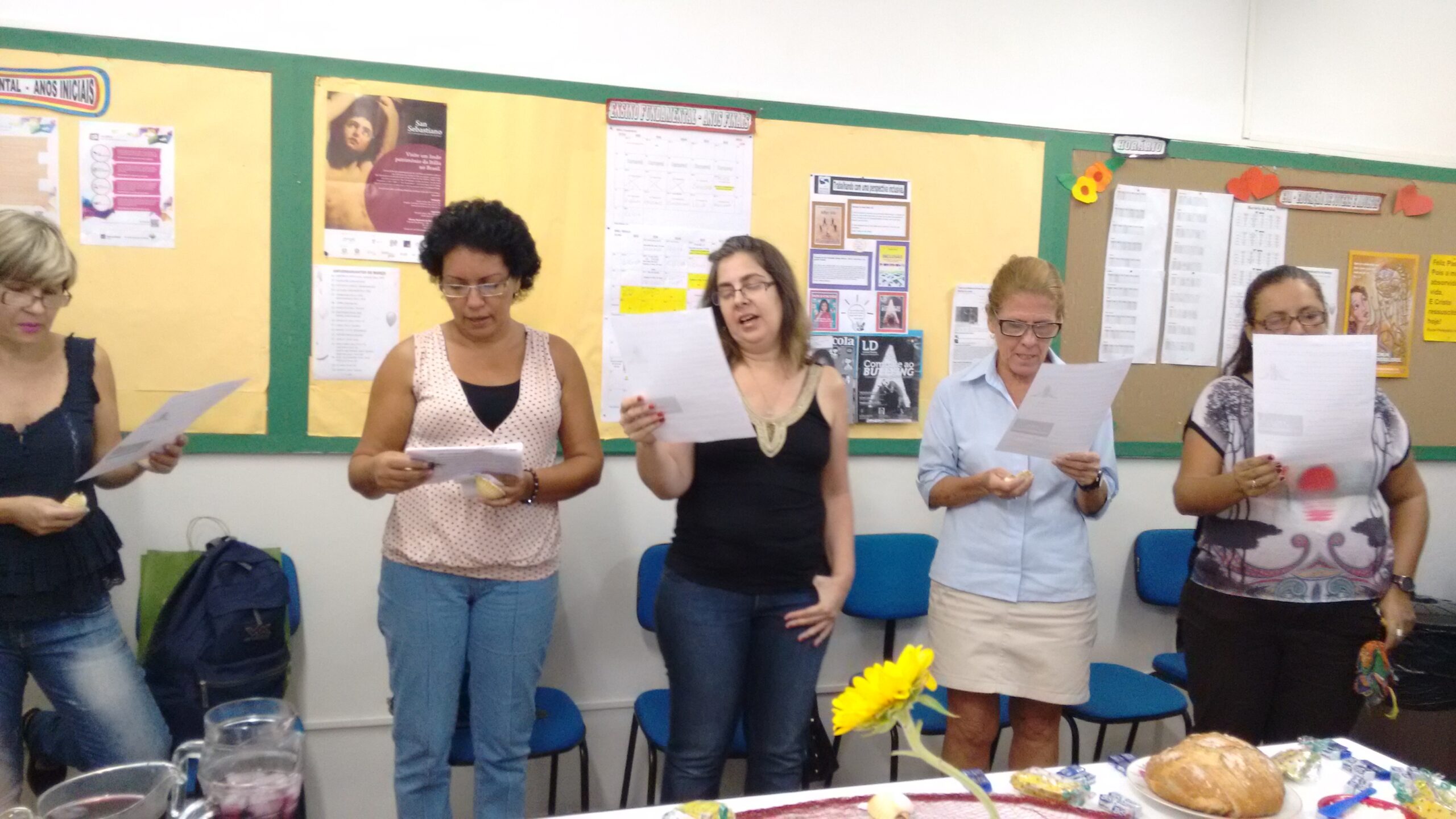 Professores e Funcionários da EJA (Educação de Jovens e Adultos do Colégio Sagrado Coração de Maria – RJ se reuniram para celebrar a Páscoa. Preparamos a Ceia com o Pão, o Vinho e a flor da Esperança. Na partilha, lembramos que a Ressurreição de Cristo nos fortalece, como Família, se nossos pés estiverem firmes rumo a um novo projeto: lutar pela justiça e a opressão.