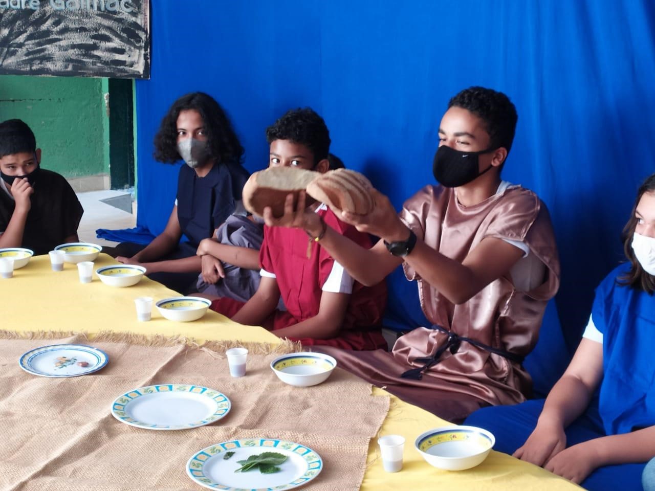 A seguir, todas as crianças, os adolescentes e os colaboradores participaram de um momento repleto de simbologia, vivências, trocas e conhecimento: a ceia judaica. Foram oferecidos, para degustação, uma erva amarga e um doce que representaram “a caminhada, o sofrimento e as aprendizagens” do povo hebreu rumo à terra prometida. Este momento celebrativo foi realizado por meio de uma encenação, fazendo  a memória da Santa Ceia. A celebração  faz  o  link entre o antigo testamento e  as releituras atuais. Para finalizar, o terceiro momento promoveu uma caça aos coelhinhos, o símbolo de prosperidade, e foi utilizado para trazer uma mensagem final para o dia. Cada participante pôde percorrer os espaços da Unidade e encontrar um coelhinho escondido. O  coelhinho foi uma moeda de troca para uma deliciosa  barra de chocolate,  que foi doada  pela Prefeitura de Belo Horizonte, via Programa do Banco de Alimentos.