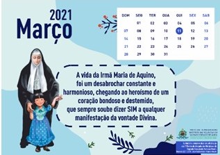Para não passar em branco datas tão significativas como essas, nós do Projeto Vida Irmã Maria de Aquino desenvolvemos um calendário e, para cada dia do mês, um pensamento extraído do livro: “O desafio de um mundo novo” (Ir. Alice Duarte), que retrata a chegada das três primeiras Irmãs ao Brasil. Desejamos que esses pensamentos nos acompanhem, motivem nossas vidas e nossos trabalhos, e que eles sejam inspiração para a vida das crianças, adolescentes e seus familiares.