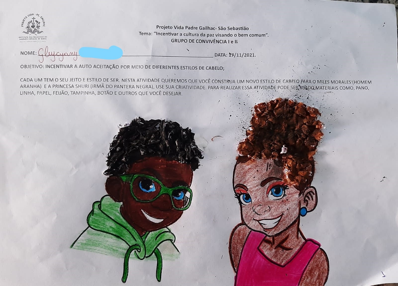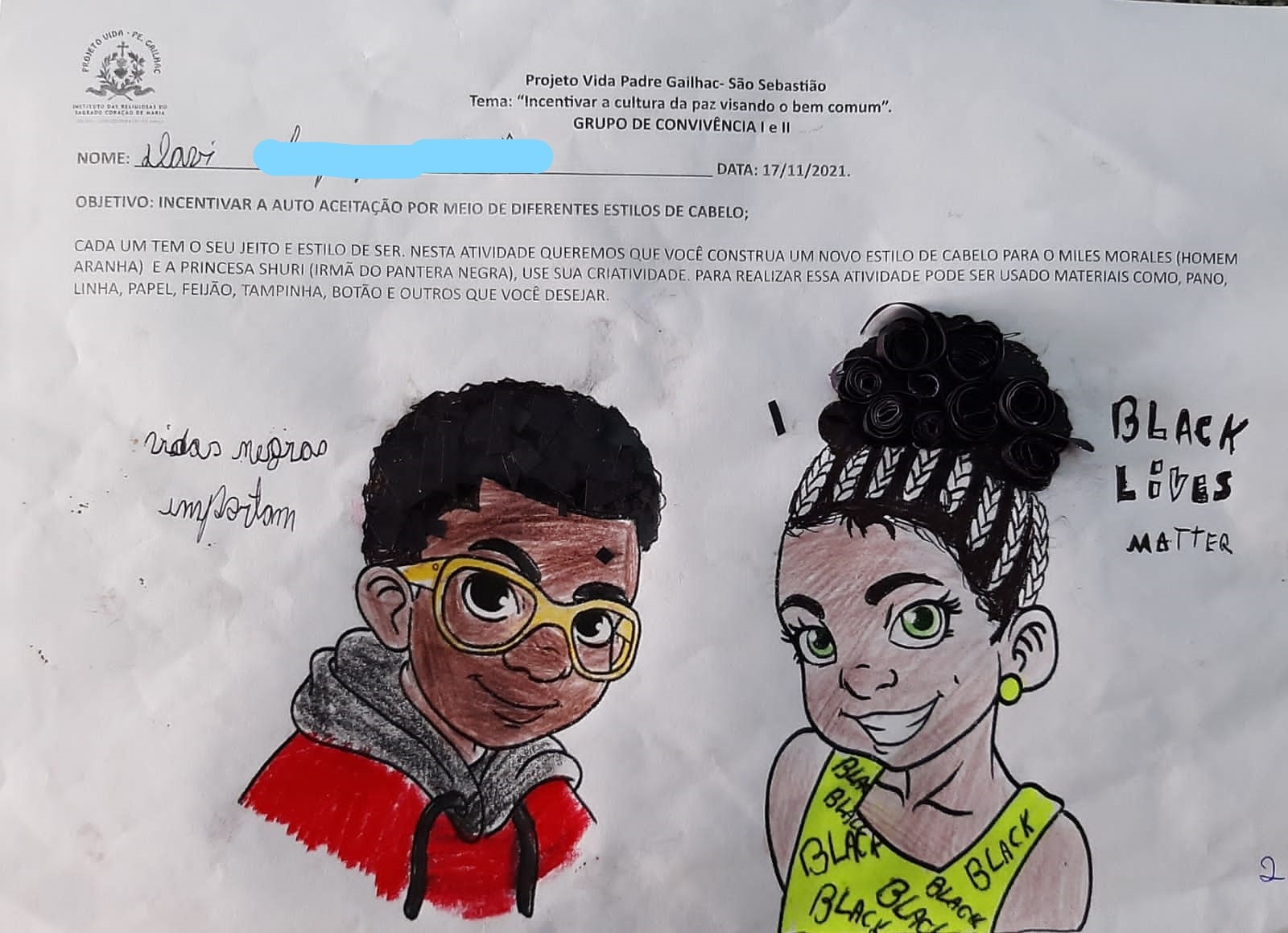 A atividade de caça-palavras abordou a história de luta do Movimento Negro no Brasil. A auto aceitação foi incentivada por meio de uma atividade de criação de cabelo para os super-heróis negros Miles Moraes (Homem Aranha) e a princesa Shuri (Irmã do Pantera Negra). Os beneficiados exploraram a criatividade para representar a diversidade racial.