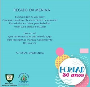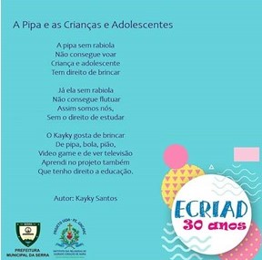 Neste ano, o Estatuto da Criança e do Adolescente (ECRIAD), lei 8.069 de 1990, que dispõe sobre a proteção integral das pessoas nessas duas fases da vida, completa 30 anos. O ECRIAD é um grande marco na conquista dos direitos das crianças e dos adolescentes em nosso país e o Projeto Vida da Serra não poderia deixar de comemorar essa data.