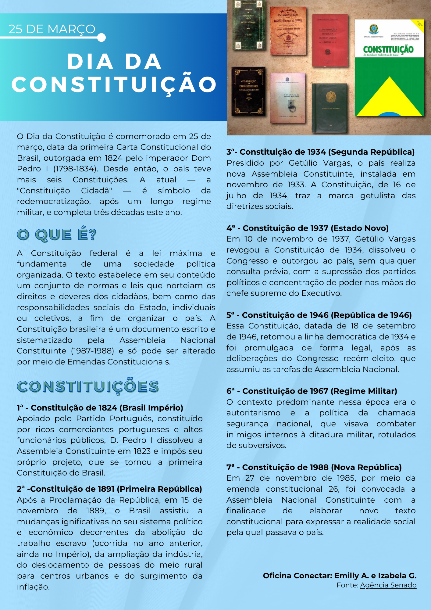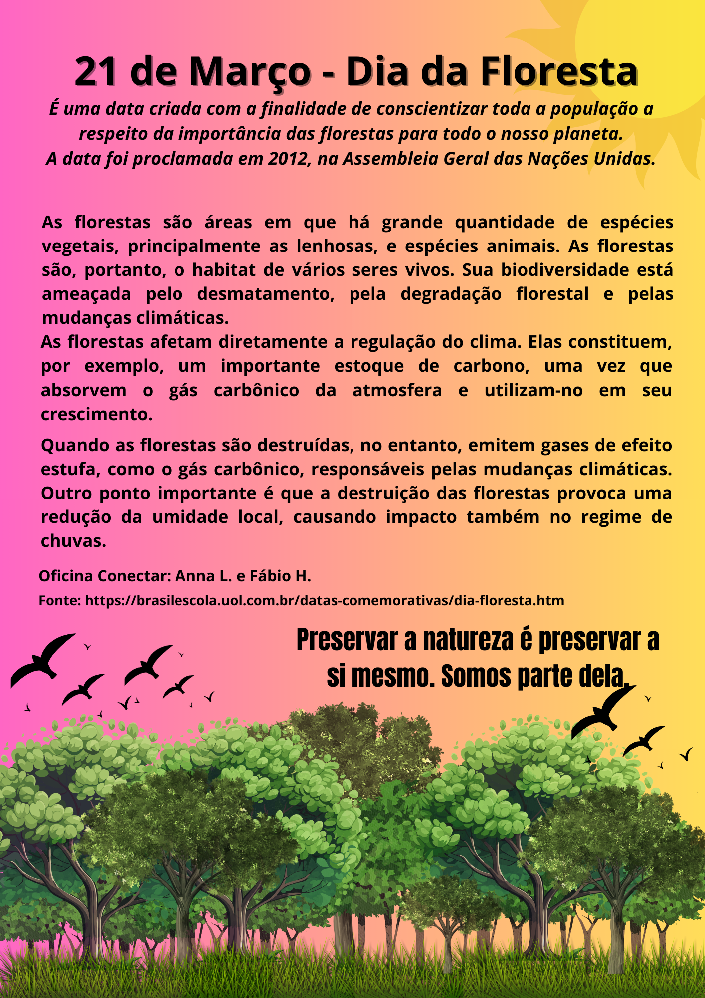 A educadora Paula Rhis tem desenvolvido, na oficina Conectar, alguns folhetos sobre as datas comemorativas com as crianças e adolescentes. A proposta foi executada em duplas com utilização do site Canva (uma plataforma de designer gráfico), em que puderam escolher com qual temática gostariam de trabalhar. As datas comemorativas selecionadas foram: Dia da Síndrome de Down, Dia contra a Discriminação Racial (21 de março), Dia da floresta, Dia Mundial da Água (21 de Março) e Dia da Constituição (25 de Março).