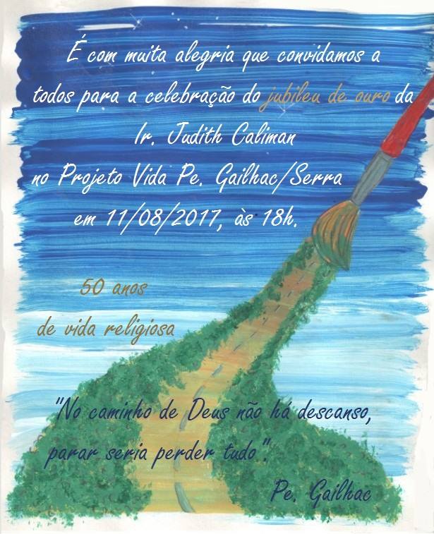 O Projeto Vida Padre Gailhac da Serra, Espírito Santo, convida a todos para a Celebração de Jubileu dos 50 anos de Vida Consagrada da Ir. Judith Caliman. Veja o convite, clique aqui.