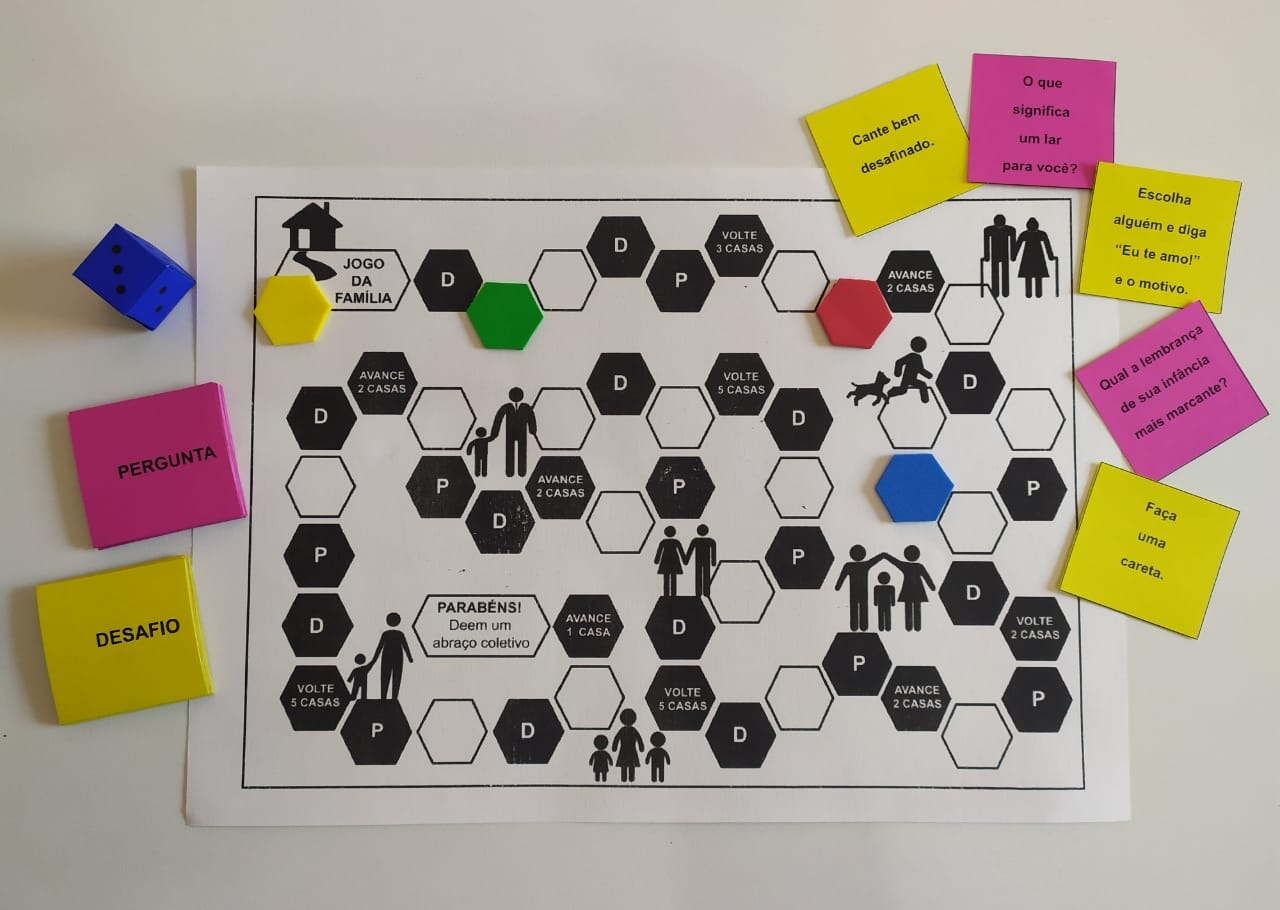 Em consonância com a Semana dedicada à Família, foi produzido na Unidade um jogo no formato de trilha. A proposta visa viabilizar a convivência e o diálogo entre os entes da unidade familiar. O Jogo é composto de um tabuleiro, peças que representaram os participantes (peões), um dado, cartinhas com perguntas bem sugestivas ao convívio e cartinhas com desafios, de modo que os participantes realizem a ação e se divirtam.