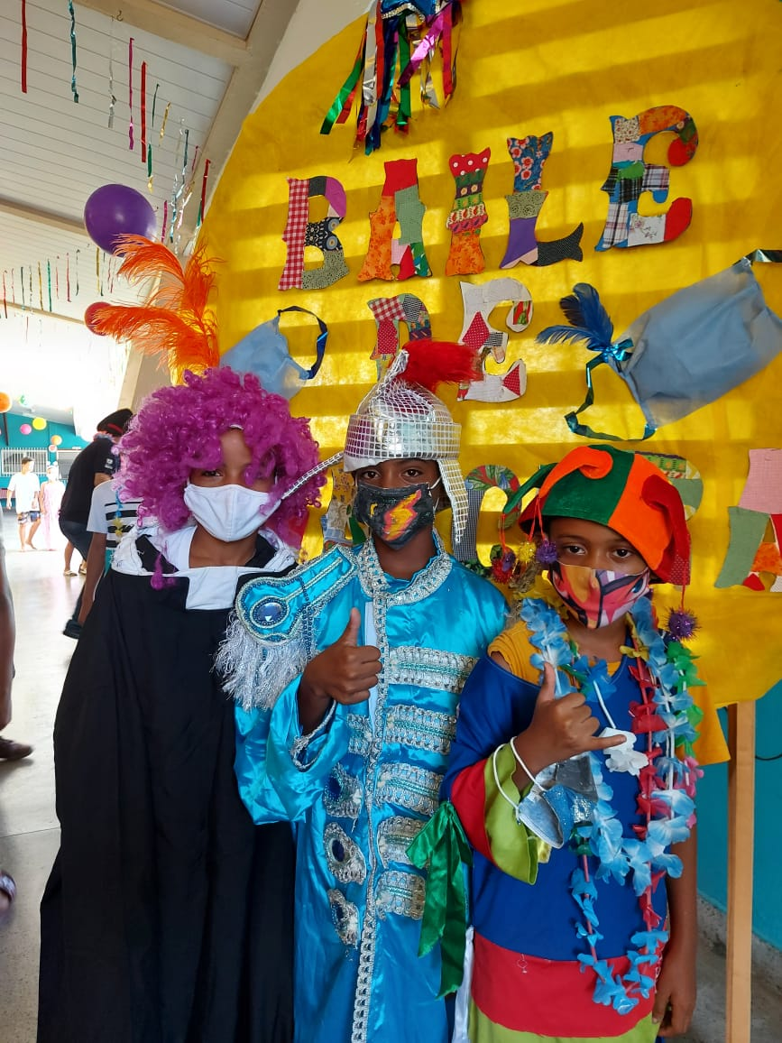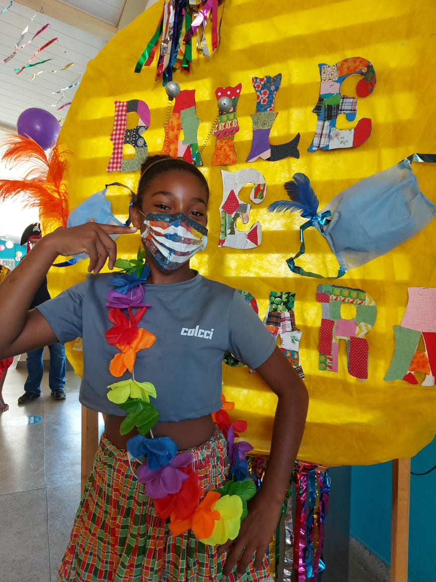 Foi uma semana de envolvimento e preparação para que o carnaval fosse festejado de forma consciente e divertida. Em uma organização, que envolveu todas as oficinas, as crianças e os adolescentes decoraram máscaras de proteção descartáveis, produziram acessórios e figurinos e, com base nas marchinhas de carnaval, construíram paródias relacionadas ao tema anual e aos nomes dos grupos. Foi um processo criativo e de muita reflexão.