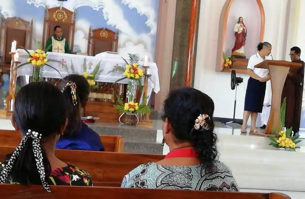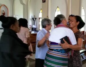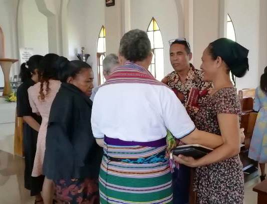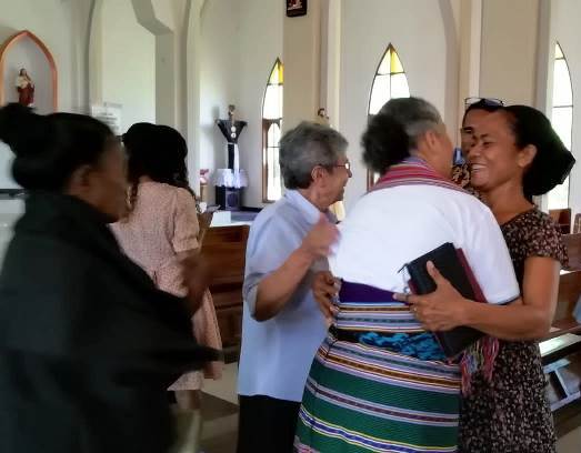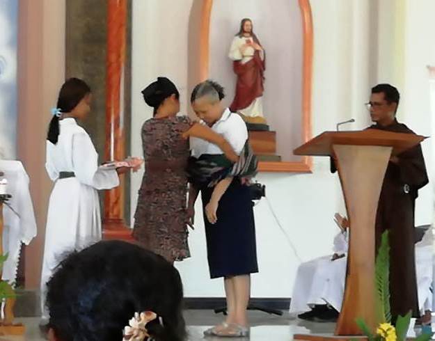 No domingo, dia 06 de fevereiro, fui apresentada na celebração da paróquia e vestida com o Taís – é o tecido tradicional de Timor-Leste, utilizado como parte do vestuário. É tecido artesanalmente por mulheres, em teares de madeira, a partir de fios de algodão e depois tingidos com corantes naturais e sintéticos. Os padrões e os motivos são originalmente tradicionais, de diversas cores e ostentam interessantes desenhos geométricos, com diversos animais: crocodilos, pássaros, galos, peixes e elementos da natureza, compostos por folhas e plantas.
