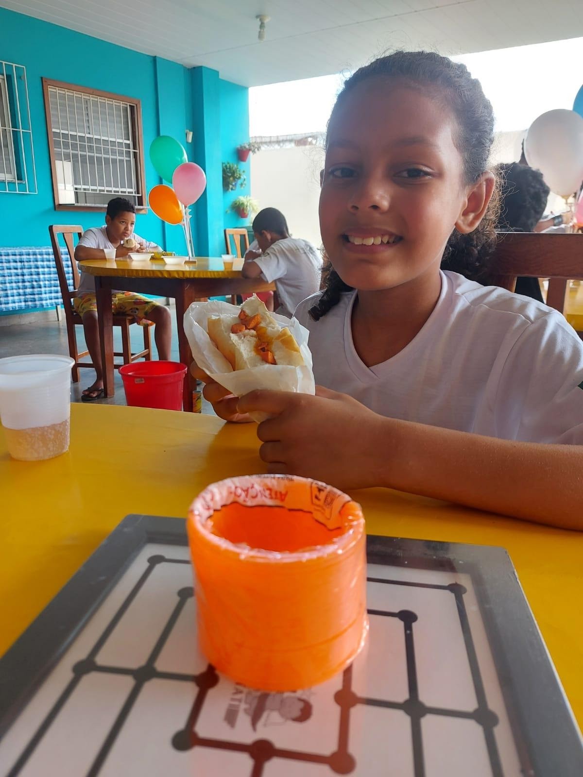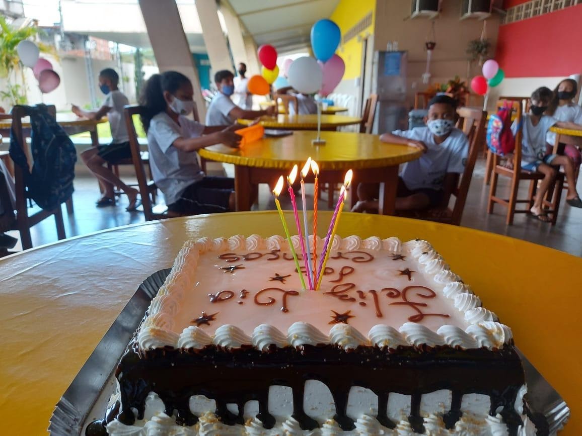 As crianças e os adolescentes reuniram-se no refeitório, que contou com mesas extras de forma que garantiram o distanciamento necessário. Após uma acolhida festiva, todos se divertiram participando de um sorteio. E, em seguida, fizeram um lanche caprichado, preparado com muito carinho. Salgadinhos, cachorro quente, sorvete, picolé e, de sobremesa, um delicioso bolo, que só foi servido depois do tradicional parabéns.