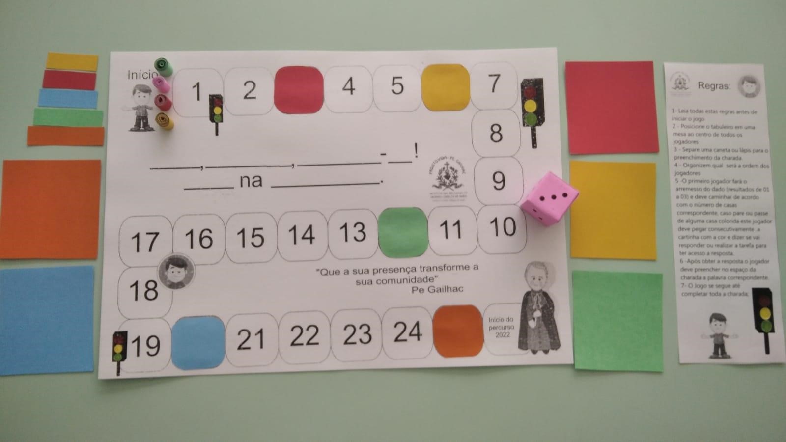 Será uma viagem pela trilha, decifrando charadas e cumprindo tarefas, em busca das respostas para completar a frase e descobrir o tema anual: “Pare, reflita, liberte-se! Atue na realidade”. Tudo preparado, com muito zelo e carinho, para que as crianças e adolescentes possam participar de forma divertida e conhecer a frase que iluminará as ações e reflexões durante o ano de 2022. Juntamente com o lema: “Que a sua presença transforme a sua comunidade”– Pe. Gailhac – que já está explícito no tabuleiro.