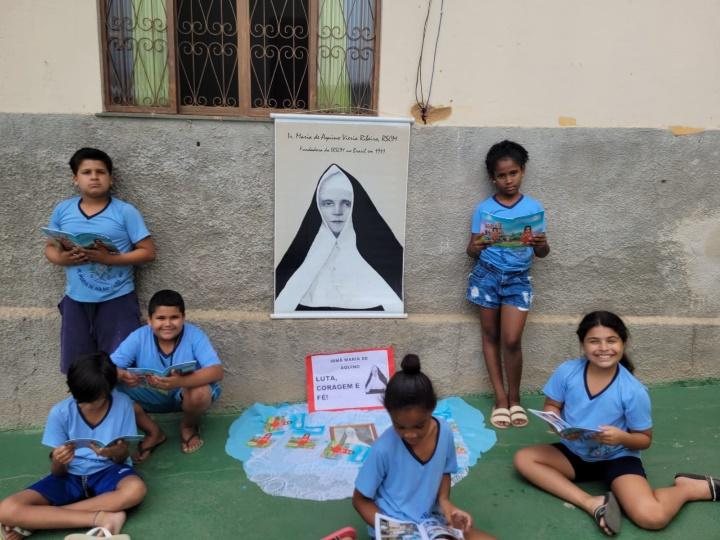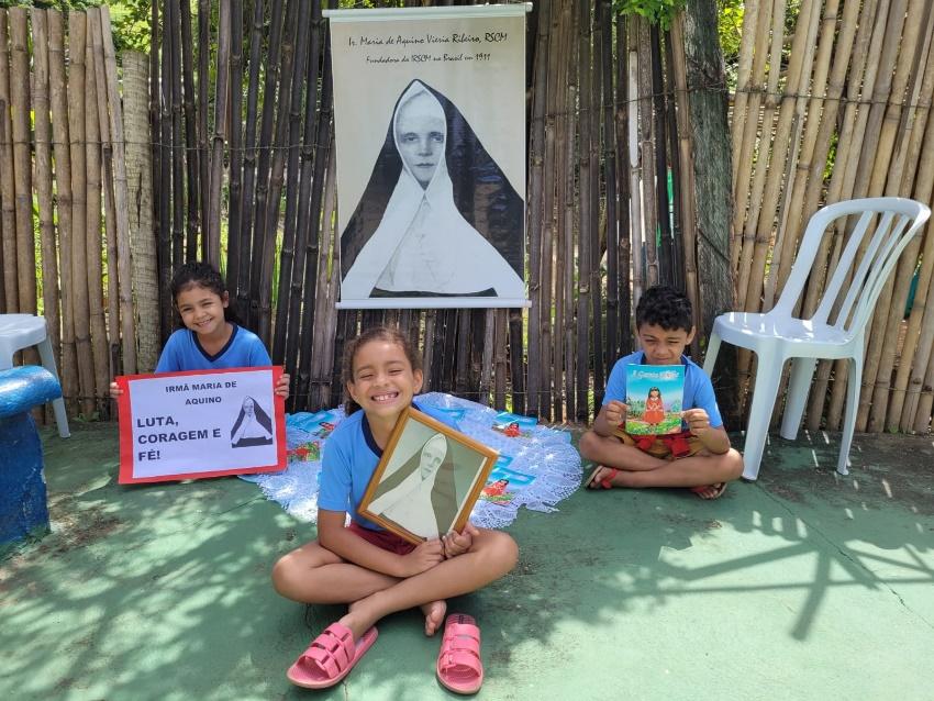 Realizamos uma roda de conversa com as crianças e os adolescentes para juntos revivermos os momentos dos 152 anos do nascimento e trajetória da Irmã Maria de Aquino.