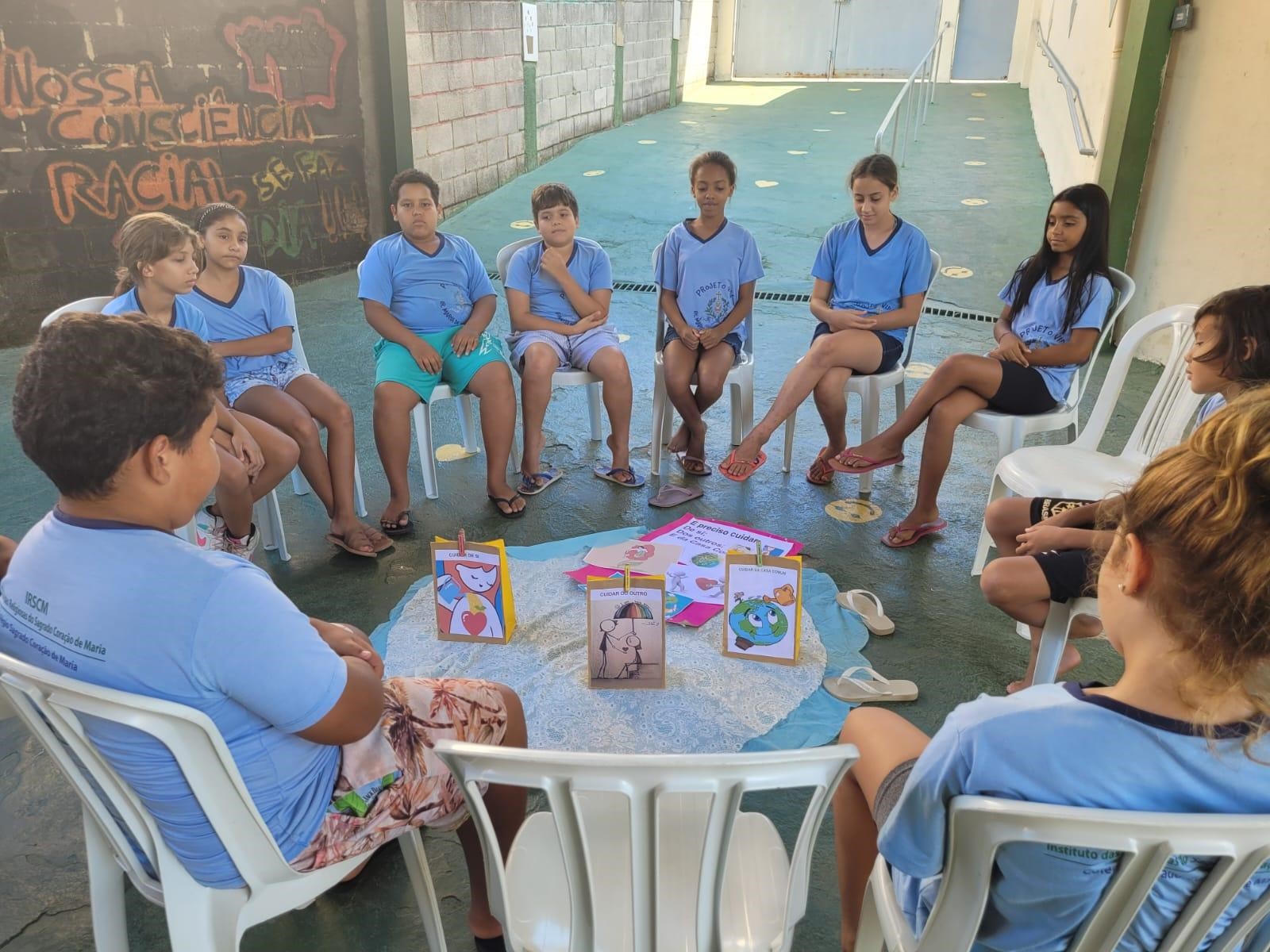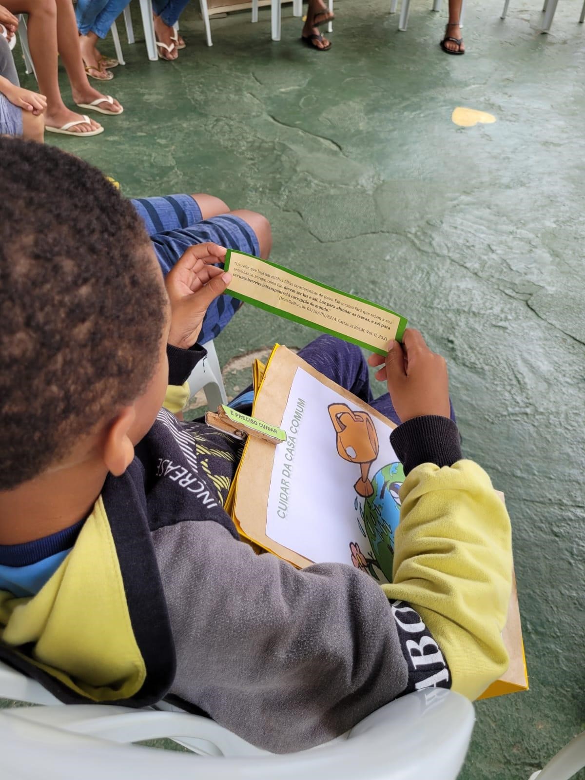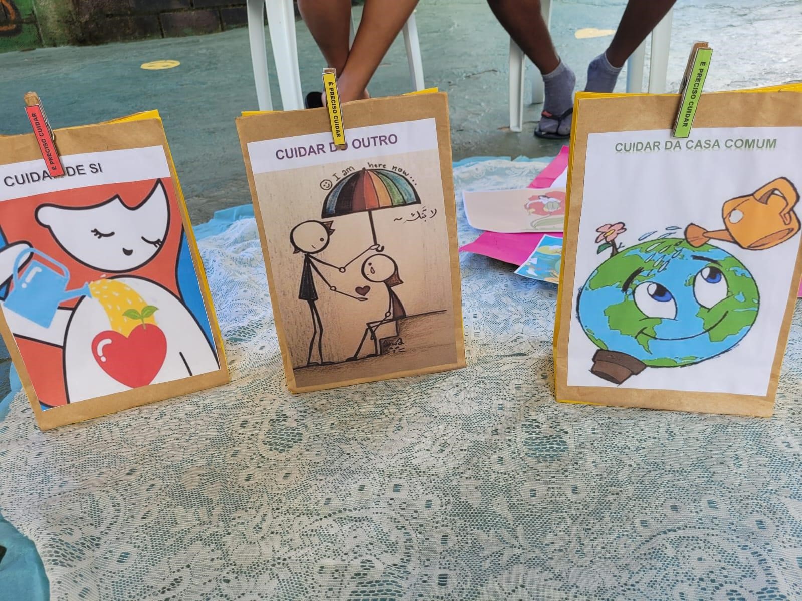 A atividade se desenvolveu propondo que as crianças e aos adolescentes escolhessem uma mensagem de um dos três pacotes disponíveis nomeados, “Cuidar de Si”, “Cuidar dos Outros”, “Cuidar da Casa Comum”. Após a leitura da mensagem foi realizada a reflexão em grupo, com sugestões de como exercer na prática o que foi refletido.