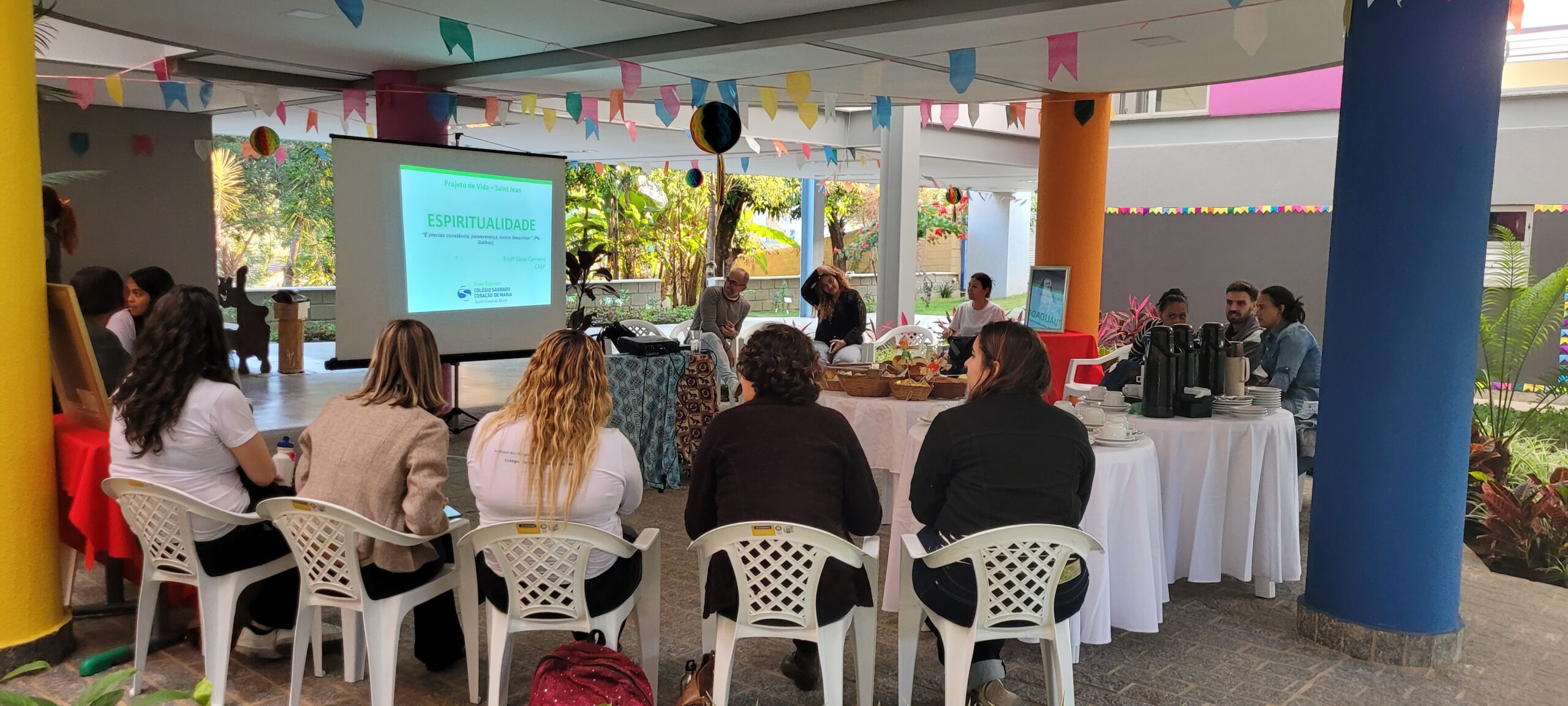 Espiritualidade foi a temática escolhida para o momento formativo organizado pela REAJE e desenvolvido pelo prof César Carneiro (que atua na mantenedora da unidade). Dentre as reflexões, o prof. César nos provocou sobre como, estamos vivendo a alteridade na nossa prática profissional. Para este momento, estiveram presentes os colaboradores das duas unidades, Projeto Vida Ir. Saint Jean e Projeto Vida Padre Gailhac e para aquecer o momento, aproximar as pessoas e refletir foi servido um delicioso café. Entre uma fala e outra, apreciamos os quitutes da casa.