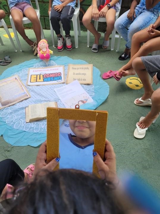 A atividade teve por objetivo despertar e exercitar o autoconhecimento entre as crianças e adolescentes. O momento aconteceu com cada um se olhando no espelho, suas características, seu olhar, seu sorriso, e ficaram livres para fazer todas as expressões diante do espelho. Em seguida, cada um recebeu uma folha com perguntas sobre si. O tema foi abordado de acordo com a idade e a necessidade que cada um tinha para respondê-las.