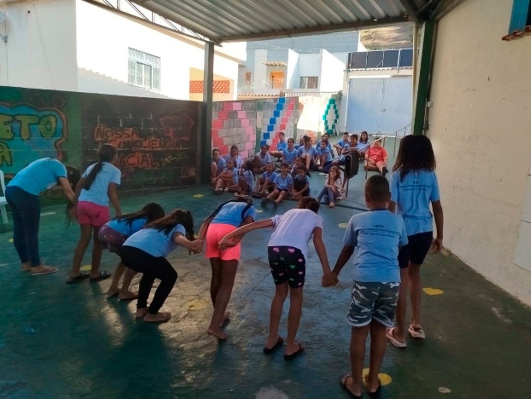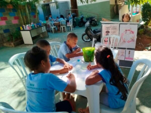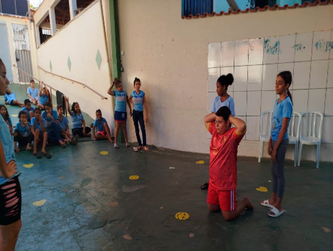 Para consolidar um pouco mais a temática, ela também foi tema da Oficina de Prática Teatral. Em ambos os turnos, as crianças e adolescentes foram divididos em seis grupos, sendo dois do matutino e quatro do vespertino. Cada grupo representou um tipo de violência doméstica: Virtual; Moral; Psicológica; Patrimonial; Sexual e Física.