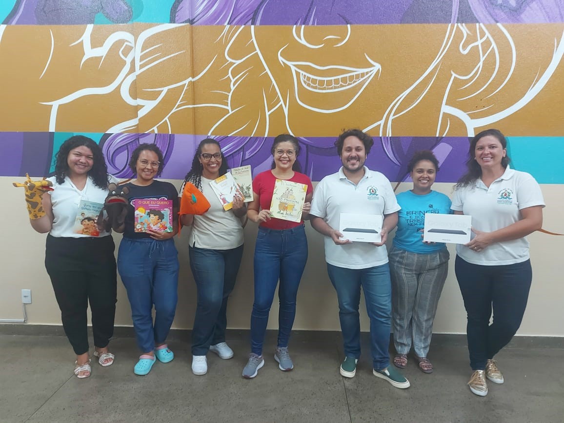 Na foto, temos, além de parte da Equipe Técnica do Projeto Vida, a equipe selecionada para fazer parte desta jornada, desenvolvendo diretamente o projeto. Da esquerda para a direita: Eliana Mendes, pedagoga que atuará como referência técnica do Projeto; Sabrina Nascimento e, ao seu lado, Rosileine Silva, pedagogas responsáveis pelo desenvolvimento das atividades junto às crianças e adolescentes; Silvani Almeida, bibliotecária responsável pela gestão do espaço de leitura.