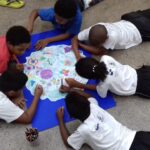 Cada criança e adolescente pintou sua mandala individual e posteriormente colaboraram na pintura de uma mandala coletiva. Em um segundo momento os participantes foram desafiados a construírem mandalas humanas, enriquecendo o trabalho reflexivo com atividades de expressão corporal.