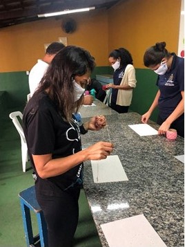 O trabalho com artesanato traz inúmeros benefícios como a ocupação da mente, melhora da autoestima, concentração e também contribui para aliviar a tensão. Com esse intuito, a oficina iniciou-se com um momento de recordações sobre bordados na vida e nas origens de cada um. Em sequência, todos elaboraram uma arte usando linhas em um bloco de papel. Durante a realização da atividade, os colaboradores tiveram a oportunidade de falar sobre boas lembranças relacionadas às experiências mais diversas e, ao compartilhar as memórias e histórias pessoais, puderam se ajudar mutuamente. A arte foi finalizada com uma decoração usando tintas, em que os participantes exploraram seus processos criativos.