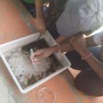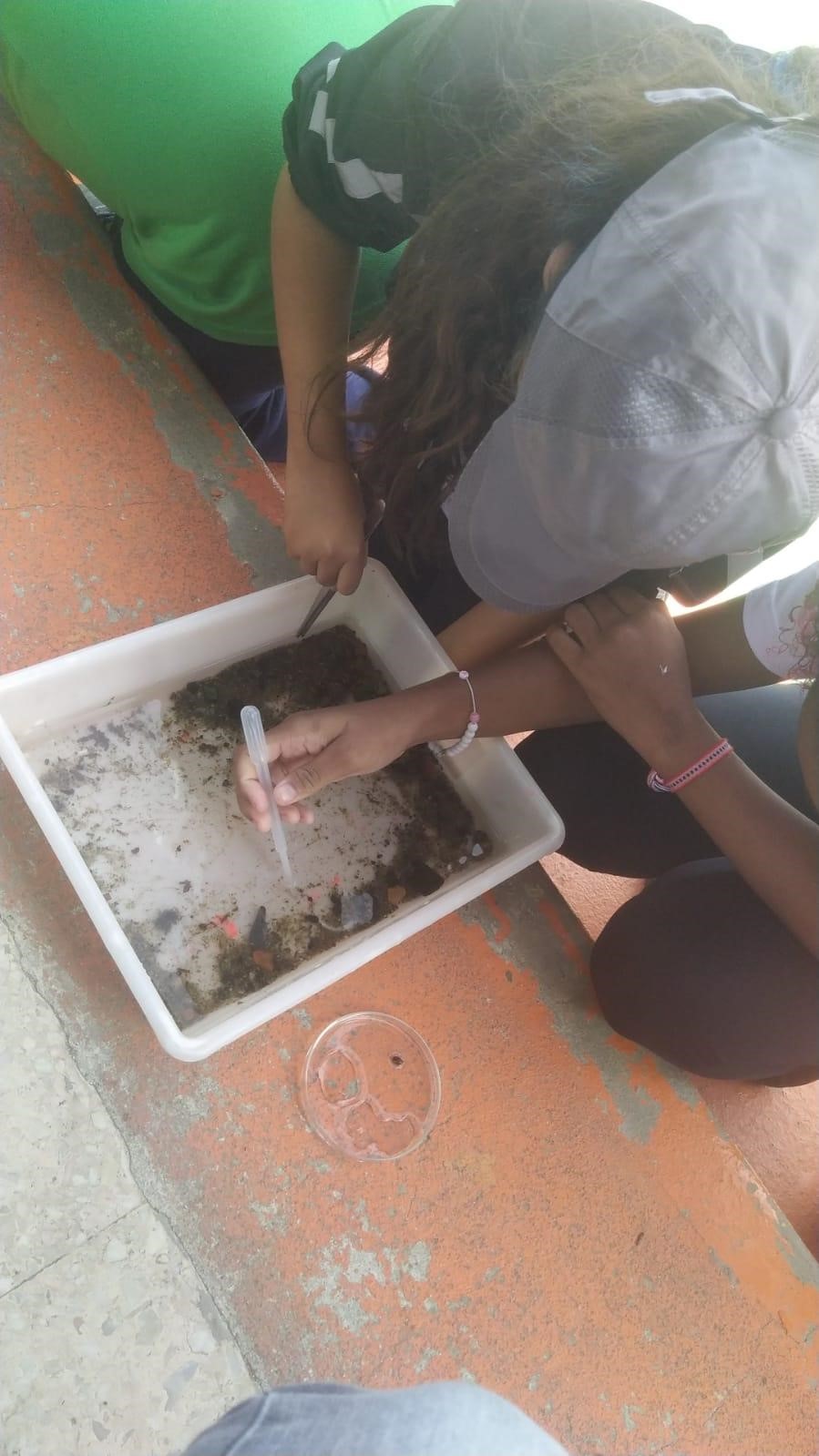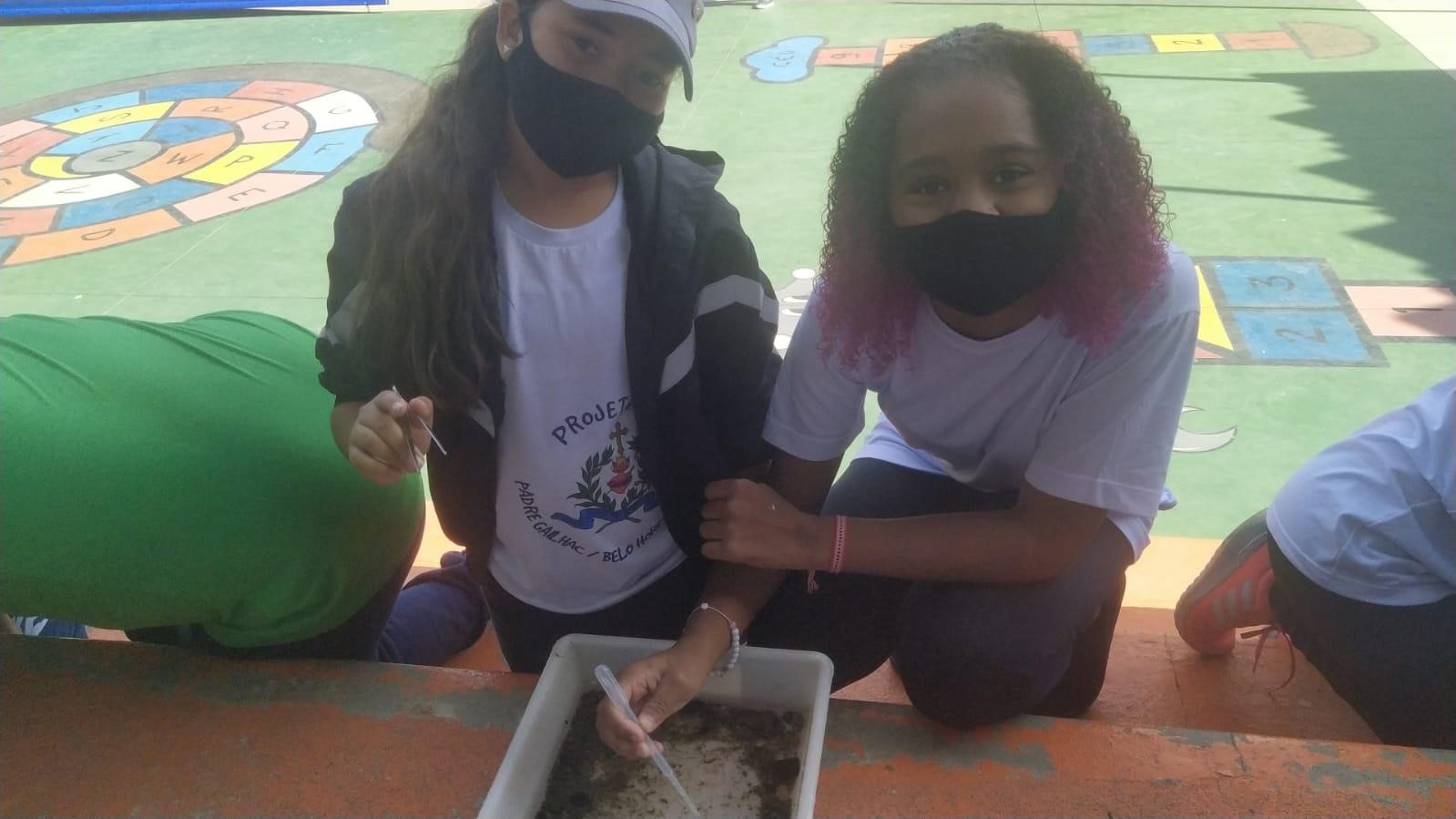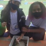 A primeira oficina de formação foi realizada no dia 07 de junho, terça-feira, na EMALC. Neste dia, as crianças e adolescentes tiveram a parte teórica e realizaram também um trabalho de campo às margens do Córrego do Capão, onde foi coletado material para análise, juntamente com a Equipe de Biomonitoramento Participativo, a professora Roseli, da EMALC, e a educadora Amanda, do Projeto Vida Pe. Gailhac.