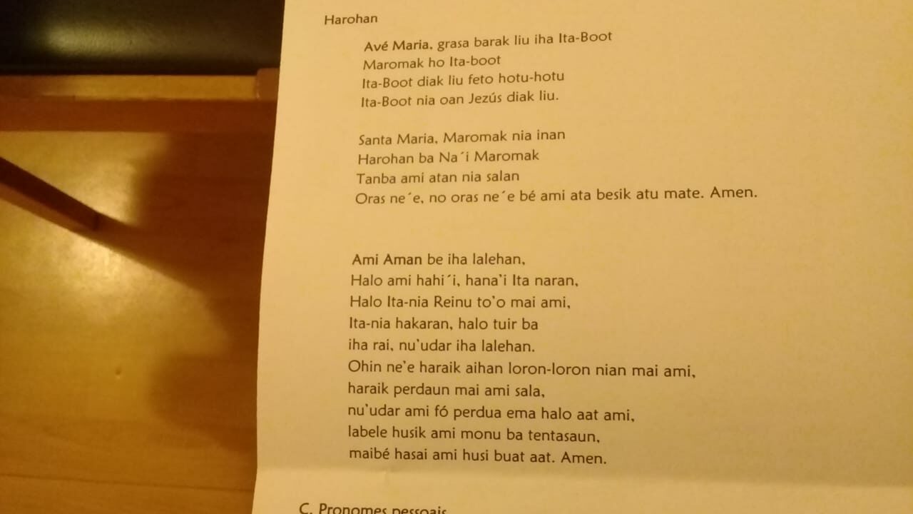 No dia 06 de dezembro iniciei as aulas de Tetum com a irmã Joana, que morou 11 anos no Timor Leste. De início, ela me deu para ler dois livros em português sobre a invasão da Indonésia e a realidade da Igreja nessa situação. Deu-me as orações da Ave Maria e o Pai Nosso, em Tetum que envio, em anexo, para que rezem também, e nesse ritmo animado.