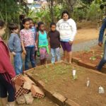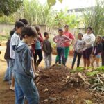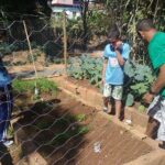 As fotos mostram um momento em que as crianças e adolescentes estão plantando sementes de cenoura, beterraba, cebola, repolho e pimentão.