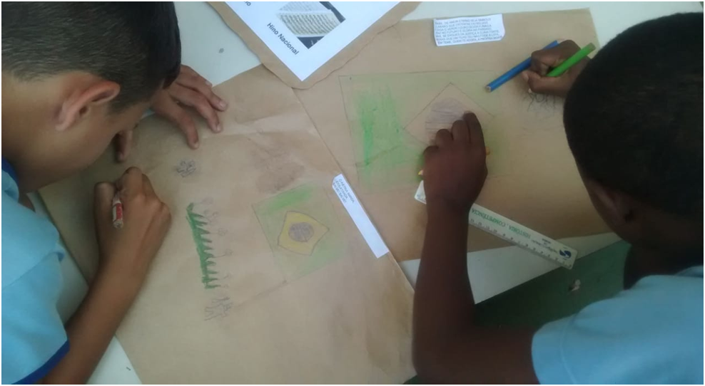 O resultado foi surpreendente, visto que as bandeiras construídas não mantiveram a mesma cor; partindo desta observação, deu início à roda de conversa, que ficou por conta das justificativas pelas cores escolhidas e das questões ambientais que assolam o país por meio das queimadas. Por fim, a educadora Gláucia apresentou também os demais símbolos; e, junto com as crianças e os adolescentes, identificaram nossas riquezas nos mesmos. Ainda na roda de conversa, a educadora ressaltou para as crianças e os adolescentes que o nosso país tem conserto e que eles serão a mudança que tanto precisamos. A seguir, a educadora trouxe para a reflexão a letra do Hino Nacional, em que foi feita uma análise, junto com as crianças e os adolescentes, da letra do Hino e a relação que a mesma tem com a floresta amazônica. A educadora distribuiu os parágrafos do Hino para que, em grupos, fossem ilustrados de acordo com o entendimento de cada participante. Devemos destacar que esta atividade foi muito produtiva, por meio da participação e interesse de todos.