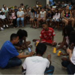 Foi promovida, no último dia 27 de maio, uma atividade intergeracional, entre as crianças e adolescentes do Projeto Vida, adolescentes, jovens, e idosos de outros Projetos do Território. A atividade, intitulada “Gerações se Unindo por Meio de Brincadeiras”, trazia em sua programação jogos e brincadeiras, planejados com referência na Semana Mundial do Brincar, e especialmente pensados para a promoção da integração entre todos os participantes. Os saberes e ciclos de vida de cada participante foram respeitados e valorizados, resultando em uma manhã e tarde muito agradáveis e divertidas.