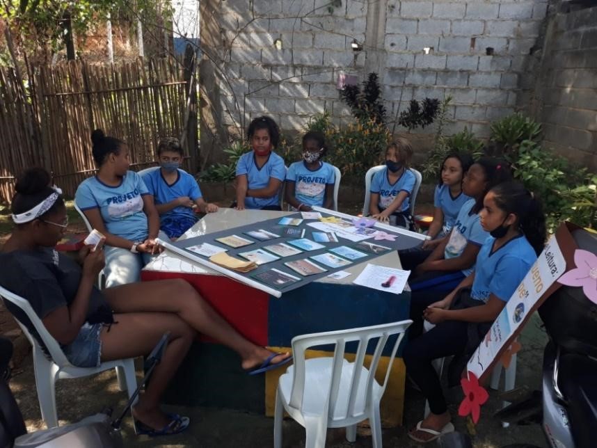 Foi montado um centro com imagens para os grupos de crianças e fichas com frases para o grupo de adolescentes. Em ambos os grupos, foi feito uma associação com a vida e como podemos ser melhores enquanto pessoa. As crianças e adolescentes expuseram seus saberes e valores ativamente.