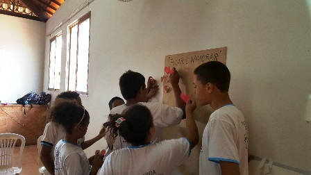 Os adolescentes foram divididos por faixa etária. Os de onze e doze anos participaram da Oficina com o tema Ficar e Namorar, com foco de discutir a sexualidade na adolescência cujos objetivos eram: Aprender a construir ideias coletivamente por meio do diálogo; compreender o significado de ficar e namorar para os adolescentes; perceber opiniões de amos os sexos sobre ficar e namorar; proporcionar aos adolescentes uma reflexão crítica sobre ficar e namorar e as questões de gênero; desenvolver a percepção do cuidado de si e da/o Outra/o.