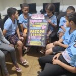 A atividade teve início com a educadora expondo dois cartazes para as crianças e adolescentes, com o objetivo de refletirem sobre o verdadeiro sentido da Páscoa Cristã.