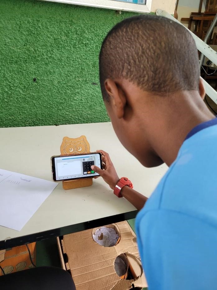 Para finalizar a atividade, realizou-se a eleição de candidatos fictícios, através do simulador da urna eletrônica disponível gratuitamente no site do Tribunal Superior Eleitoral. Foi a parte prática, onde as crianças e adolescentes simularam a escolha de representantes municipais (prefeito e vereadores).