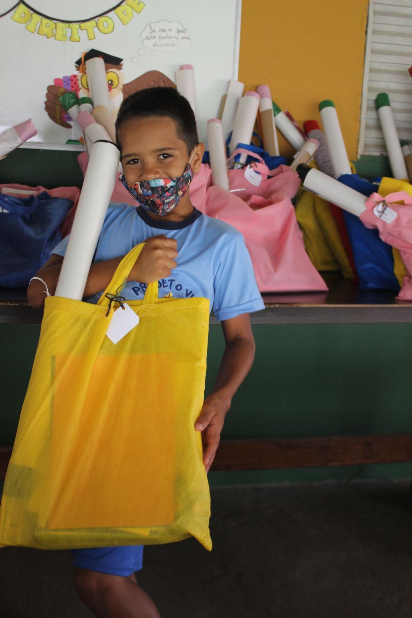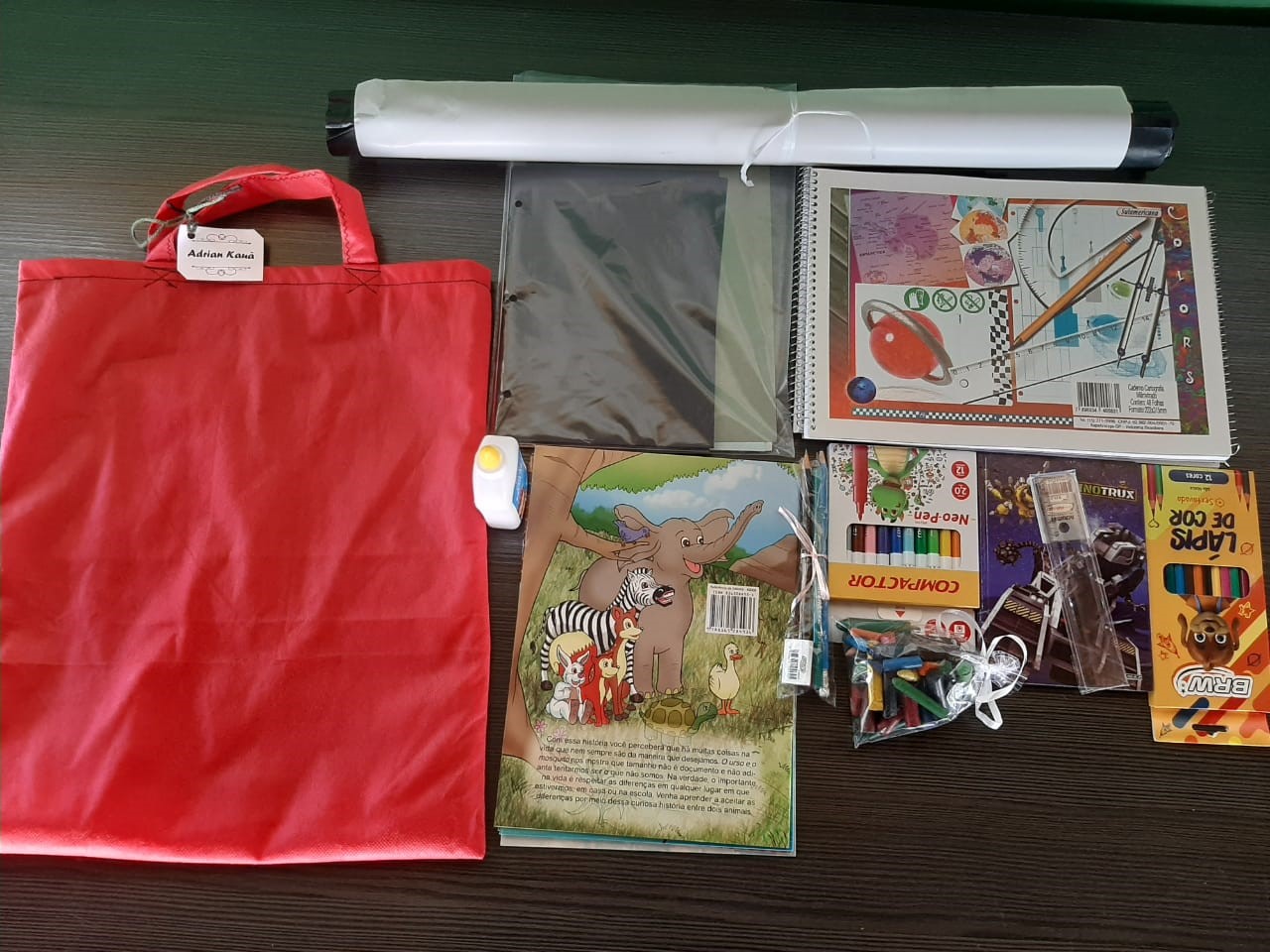 O kit continha materiais escolares, agenda e 4 livros de literatura infanto-juvenil. O material foi entregue em uma sacola de TNT, doada pela assistente social, juntamente com uma etiqueta personalizada com o nome de cada beneficiário(a).