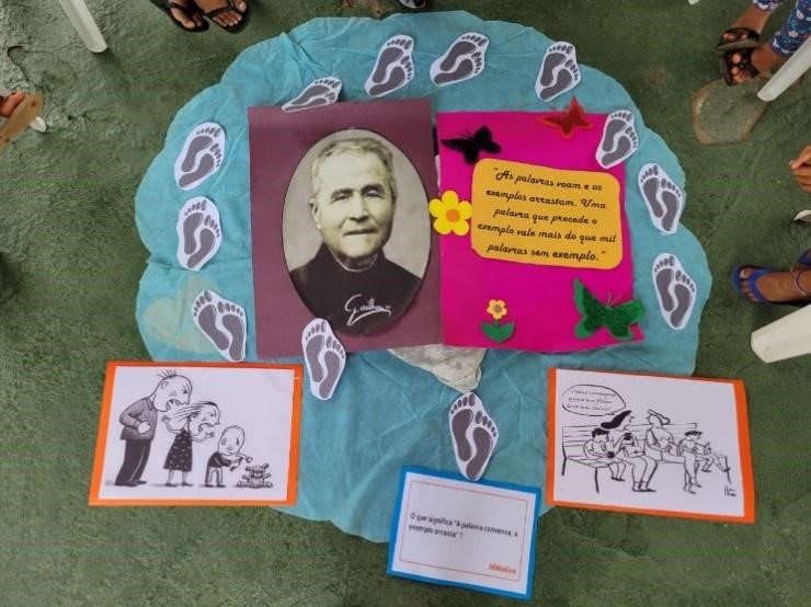 O momento iniciou-se com a educadora social falando sobre o tema do mês de março do Ano Jean Gailhac, “AS PALAVRAS VOAM, E OS EXEMPLOS ARRASTAM”. A menção ao fundador do IRSCM com seus exemplos de vida, fé, coragem, sabedoria, carisma, e suas obras continuadas, foram evidenciadas.