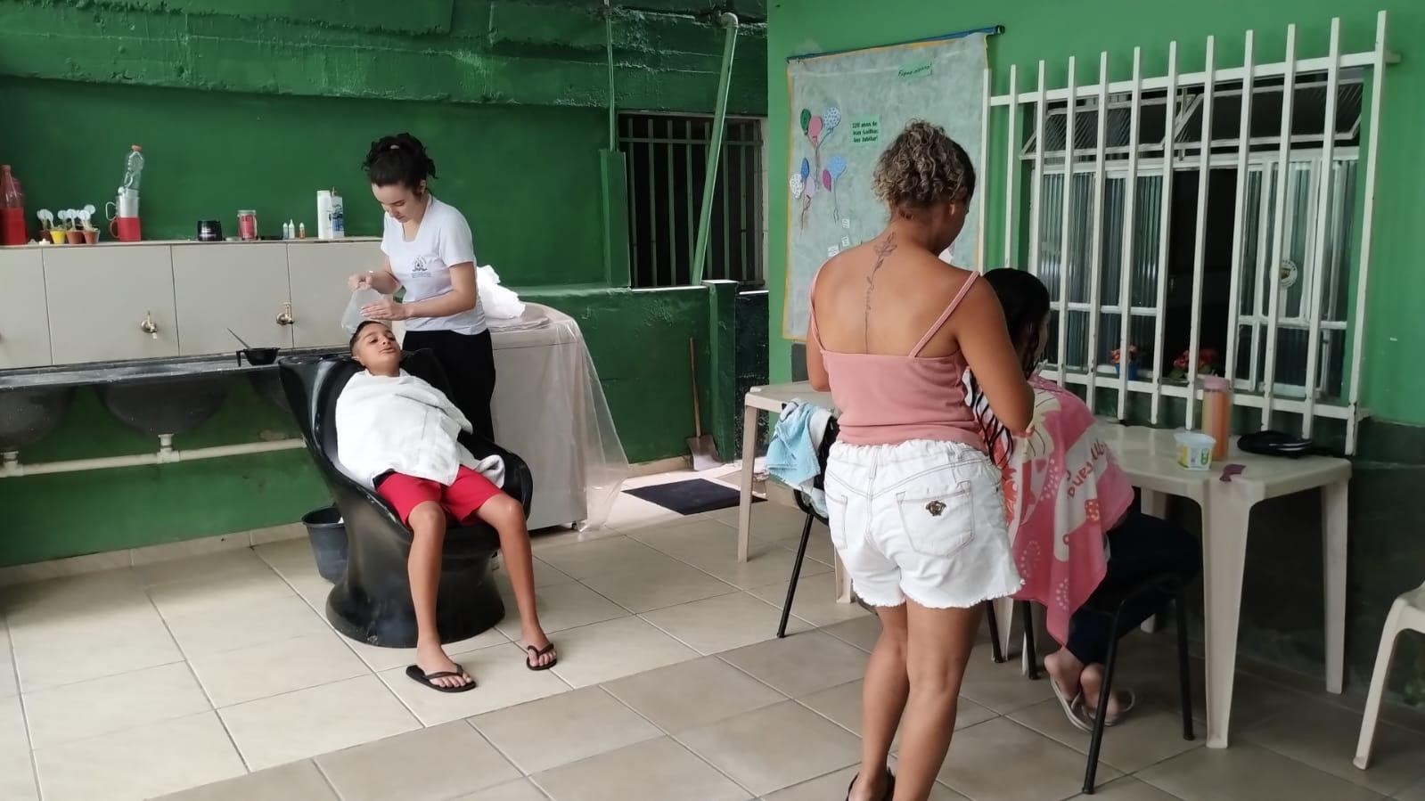 No primeiro dia a atividade foi desenvolvida no formato de SPA, com hidratação e penteados nos cabelos, cuidados com as unhas, cabine de fotos, cinema com pipoca e suco.