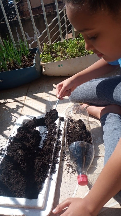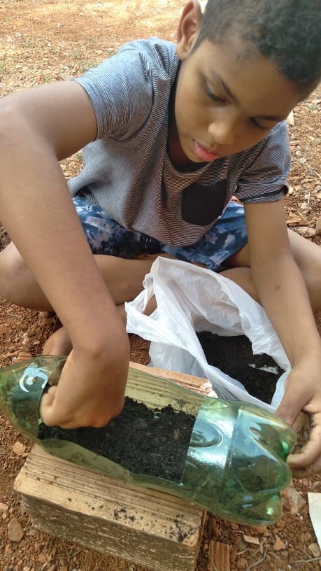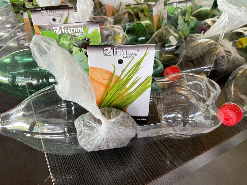 Com a ajuda da família, as crianças e os adolescentes plantaram cebolinha e coentro. Para a realização da atividade, todos receberam uma garrafa pet já preparada, brita, terra adubada, sementes e um informativo sobre como fazer o plantio e os cuidados com as hortaliças.